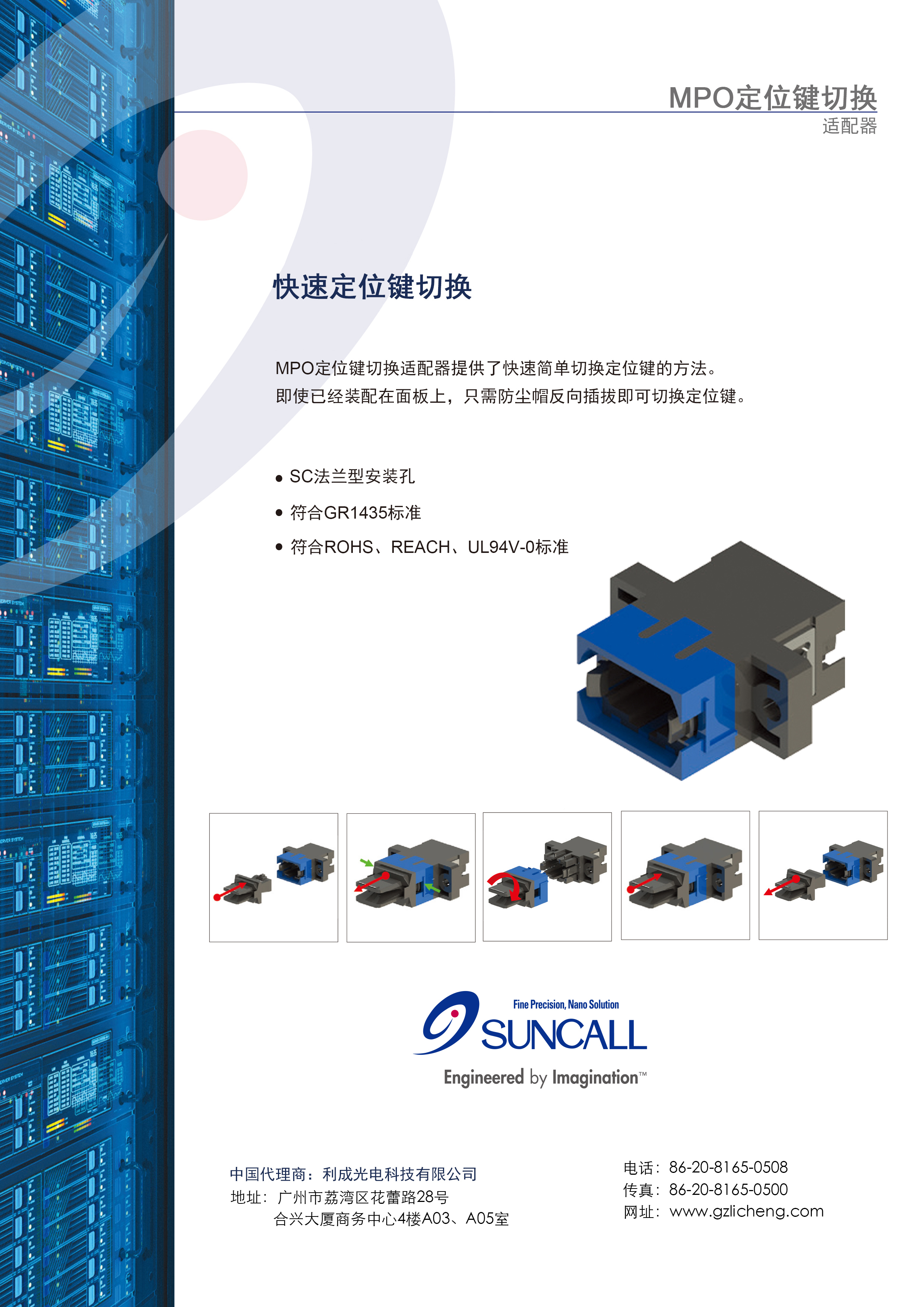 SUNCALL 首頁 > 技術(shù)支持 > 產(chǎn)品單張 > SUNCALL MPO可互換極性適配器 來源:本站作者:admin日期:2020/2/20閱讀 0 上一篇:新型LC內(nèi)置遮光板適配器 下一篇:高密度MPO連接器